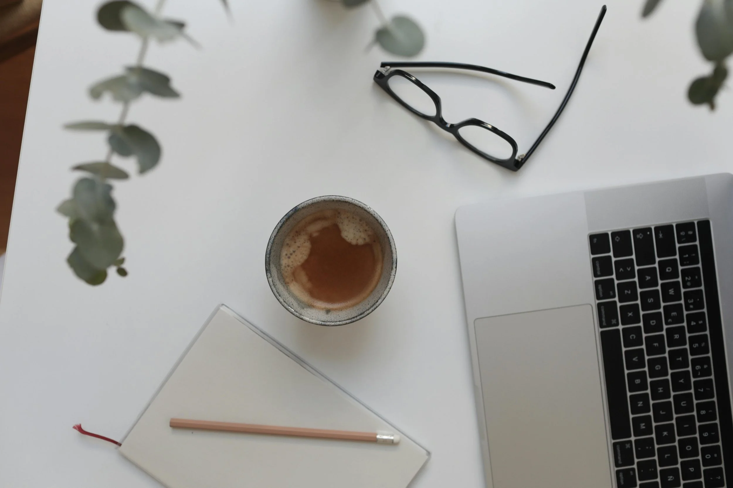 White desk with sprig of eucalyptus, cup of coffee, glasses, and notebook.